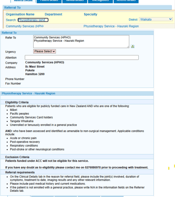 Within BPAC search Community Services (HPHO) Physiotherapy service - Hauraki region.